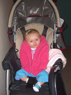 Callie also inherited some great toys from another baseball family. She now has an Exersaucer and a Jumper and she has so much fun in both of them. She doesn't quite jump in the Jupmer yet, but just kind of bounces. We are also getting lots of exercise and stroller time in since you walk every where. The other day we did a 5K walk with two of the other wives. And let me tell you, it was not leisurly. For those of you that are familiar with my exercise habits, it was definately a challenge, but it was fun. We will probably do it quite a bit.