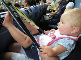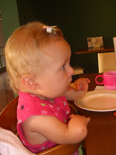 Most Japanese restaurants don't have high chairs (weird, I know). So we usually just push Callie's stroller up to the table and she hangs out there. We couldn't fit the stroller in the car so we were glad the restaurant had a booster seat. Callie loved it! She did great throughout the whole dinner, especially since we were out past her bedtime. She did keep trying to steal my food though :)