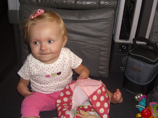 Our flight from Osaka, Japan to Detroit, MI was definitely an adventure. Callie did really great during the first part of the flight. She even fell asleep right as the plane started to taxi, but that only lasted about 30 minutes. She had a ton of fun playing on the floor in front of our seats. We had the bulk head row and had about five feet of room before the wall. Callie also enjoyed all the attention to received from the flight attendants and also flirted with all the business men that were on board too :)