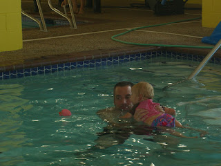 We have Callie in two different activities each week, swim lessons and Kindermusik. She loves both of them and this week I actually brought the camera and got some cute pictures. Tuesday was her first swim class with Daddy. It took her a little while to get used to being in the pool with him, but once she went underwater she had a blast and really enjoyed it.