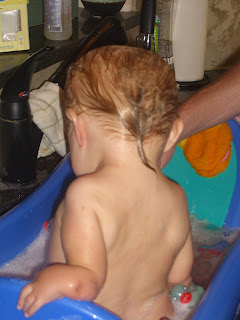 If the New Kids On The Block were still around Callie would be a huge fan. She's even got the rat tail to prove it :) Her hair is getting so long, especially in the back, it reaches all the way down her neck. Scott thought it would be "cute" to make a rat tail during bath time tonight :)