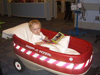 The best part of 5P was the "Red Wagon Express". We finally convinced our nurse to let us pull Callie around in the wagon and she loved it. When we first arrived she was considered to be in isolation because of all the diarrhea she was having, but once that got better we got to explore a little bit . . .