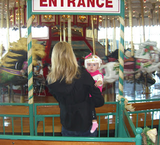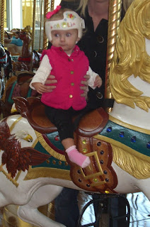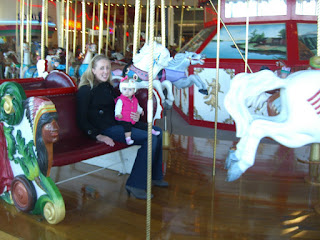On Wednesday we made a trip to the Jantzen Beach Shopping Center, which is right across the river in Portland, OR, to ride the carosel. According a sign posted at the entrance it is the fastest moving, at 10 mph, and longest ride, 4 minutes, in the world. I wasn't too sure if Callie would like riding on a horse for that long so we took the safe route and sat on one of the benches. She loved it!
