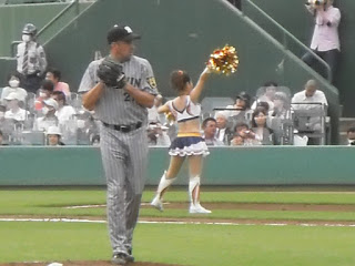 My Dad and I were able to go to an away game the second day they were here. It was a day game so my Mom stayed home to watch Callie after she woke up from her nap. It was the first baseball game that I have actually been able to watch (you baseball mom's know what I mean) in two years. Scott pitched two innings and got the win! My Dad took this picture (can you tell) of Scott warming up while the cheerleaders were dancing . . .