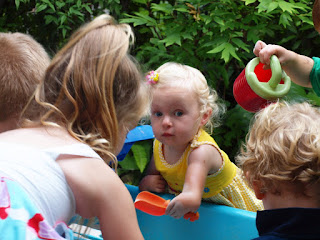 Playing in the sand box. Callie loved this, and even after all the other kids got bored and came back inside, she stayed and played by herself!
