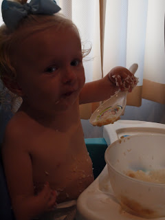 too cute;-) She is getting so big. Love her eating with the huge spoon